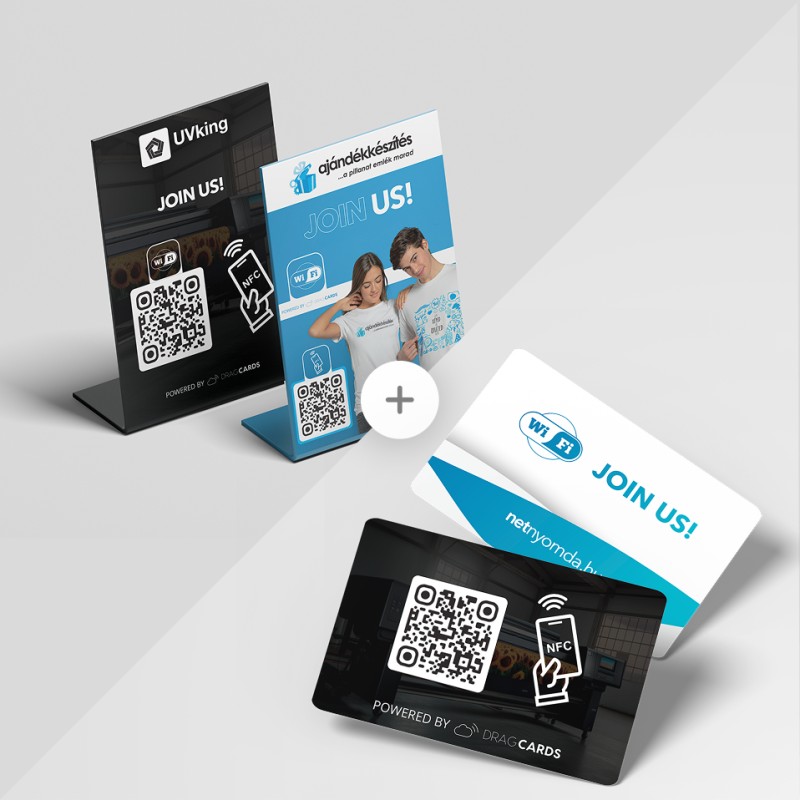 Add át a Wi-Fi-t egyetlen érintéssel! A csomag tartalmaz egy NFC-s kártyát és egy elegáns NFC-s táblát, amelyekkel a vendégeid azonnal csatlakozhatnak a hálózatodra jelszó nélkül, gyorsan és hibamentesen. PRO verzió, tehát egyedi logóddal készítjük.
